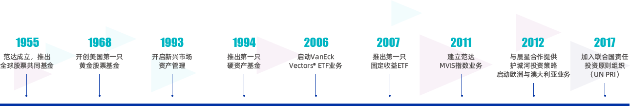 作为前瞻性投资的时代先驱,范达曾在国际股票(1955年)、黄金股票(1968年)、新兴市场股票(1993年)和ETF业务(2006年)等方面做出超前布局,在专业细分领域长期处于领先地位。范达总部位于美国,在中国、澳大利亚、德国、荷兰和瑞士等设有分支机构。